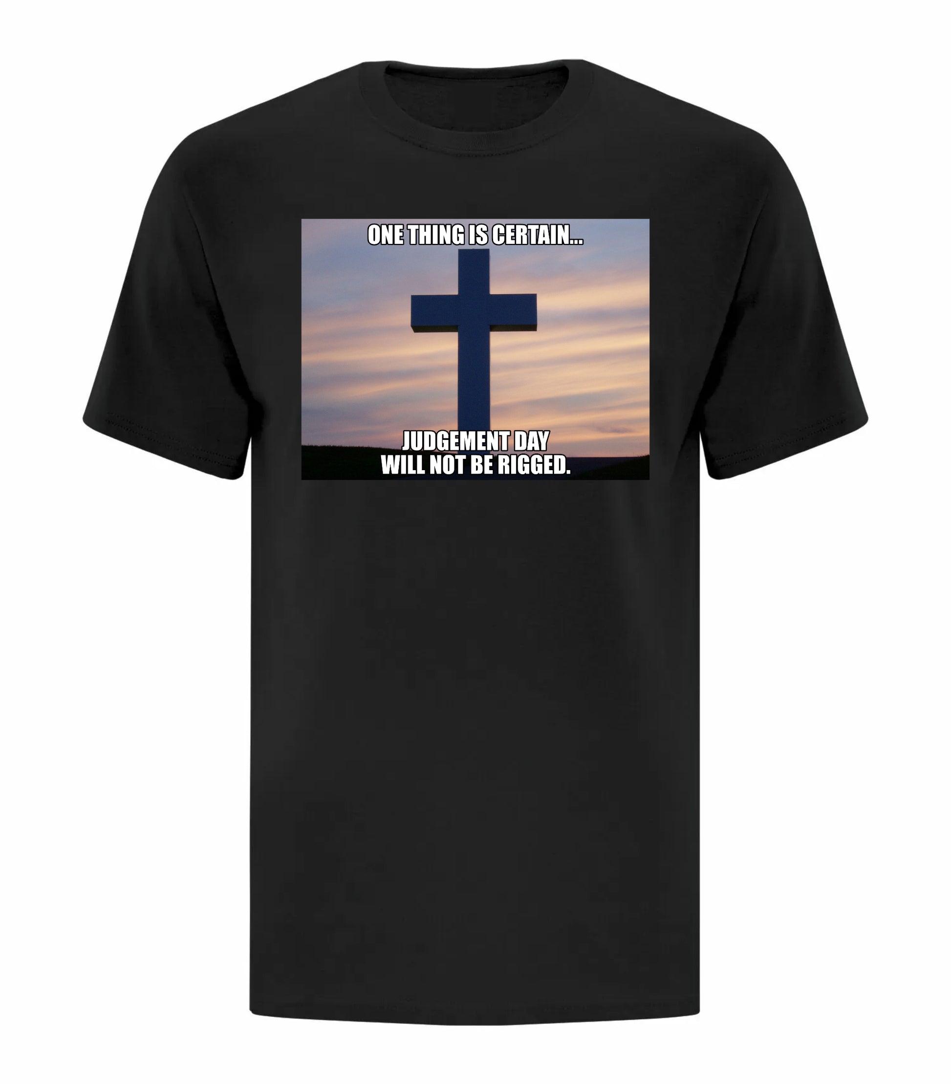 Apparel with custom "Judgement Day Will Not Be Rigged" artwork.